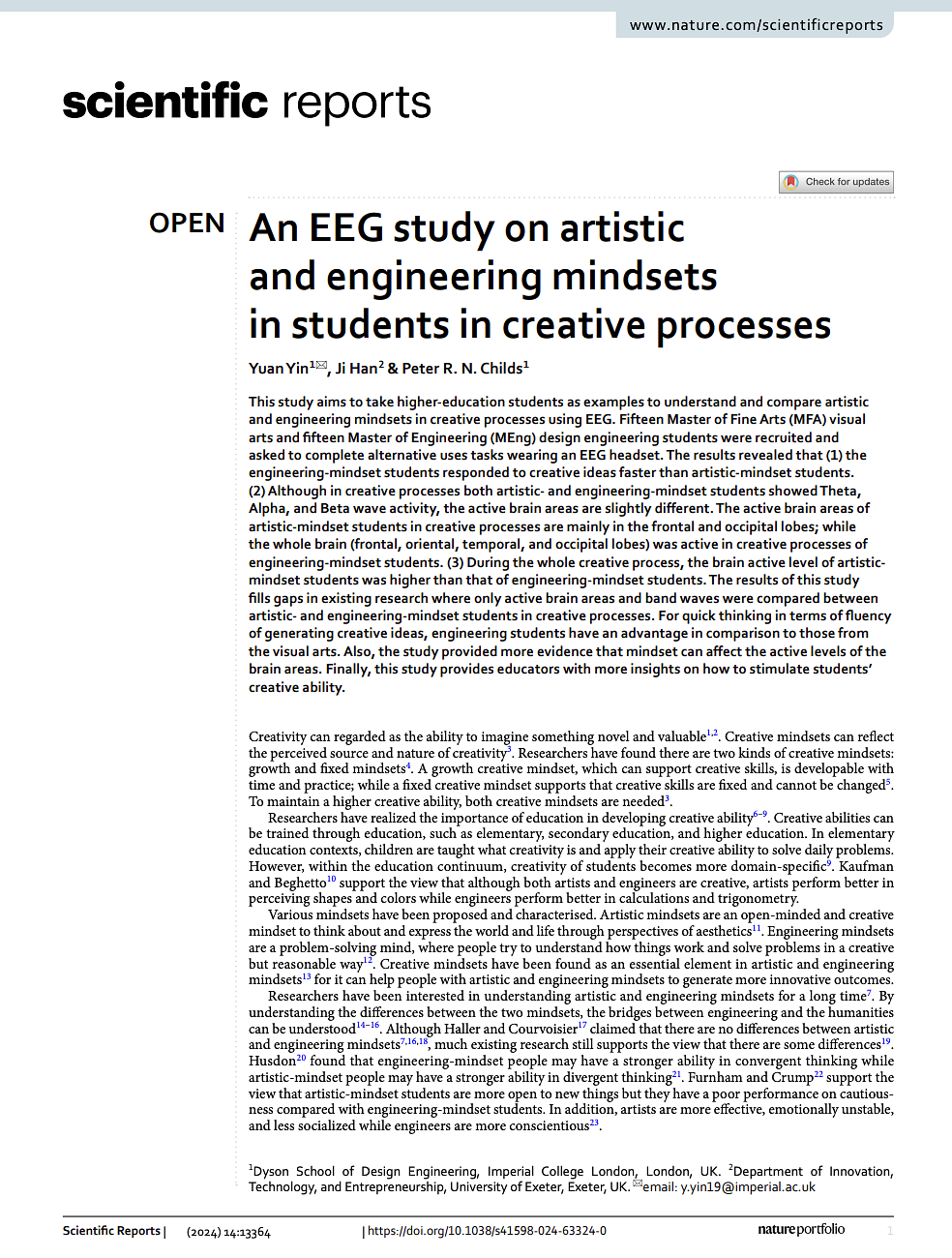 This study aims to take higher-education students as examples to understand and compare artistic and engineering mindsets in creative processes using EEG. Fifteen Master of Fine Arts (MFA) visual arts and fifteen Master of Engineering (MEng) design engineering students were recruited and asked to complete alternative uses tasks wearing an EEG headset. The results revealed that (1) the engineering-mindset students responded to creative ideas faster than artistic-mindset students. (2) Although in creative processes both artistic- and engineering-mindset students showed Theta, Alpha, and Beta wave activity, the active brain areas are slightly different. The active brain areas of artistic-mindset students in creative processes are mainly in the frontal and occipital lobes; while the whole brain (frontal, oriental, temporal, and occipital lobes) was active in creative processes of engineering-mindset students. (3) During the whole creative process, the brain active level of artistic-mindset students was higher than that of engineering-mindset students. The results of this study fills gaps in existing research where only active brain areas and band waves were compared between artistic- and engineering-mindset students in creative processes. For quick thinking in terms of fluency of generating creative ideas, engineering students have an advantage in comparison to those from the visual arts. Also, the study provided more evidence that mindset can affect the active levels of the brain areas. Finally, this study provides educators with more insights on how to stimulate students’ creative ability.